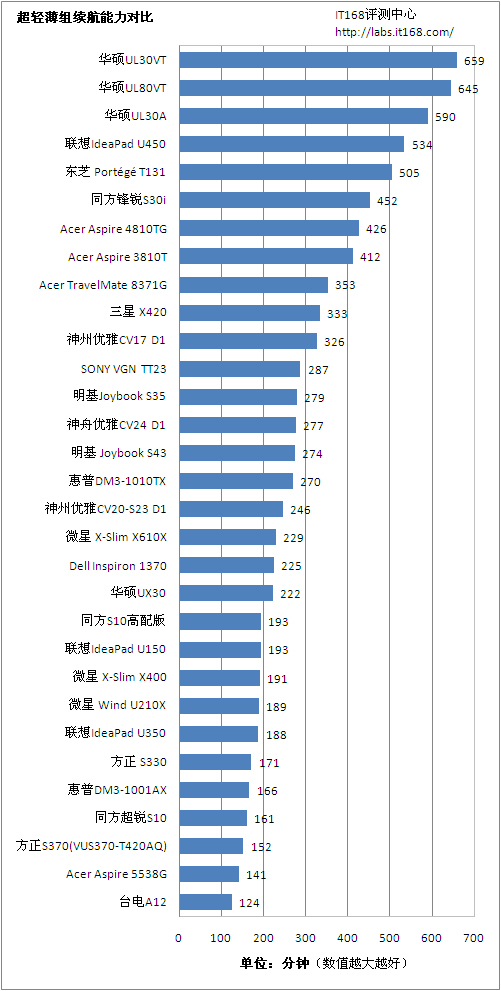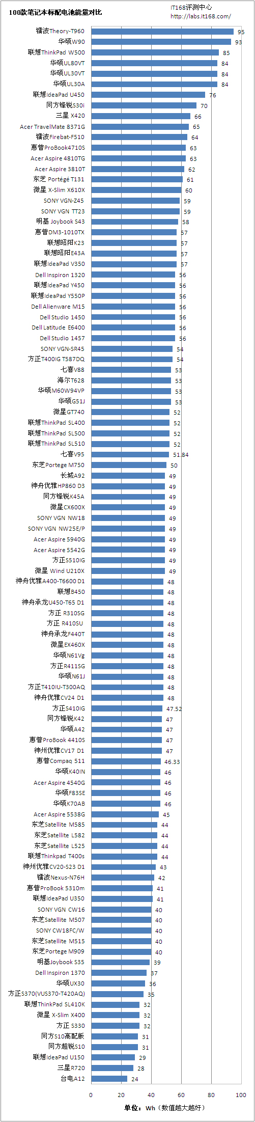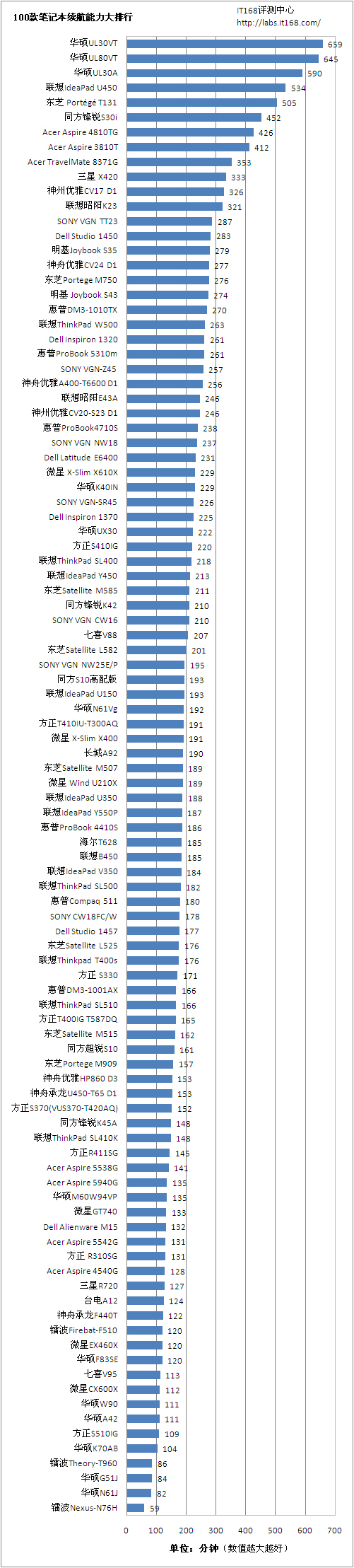 筆記本電腦的續航能力可以說是一個老生常談的話題,可一直以來卻是受到廣大消費者的關注。其原因很簡單,多數購買筆記本的網友無非就是看重其移動性,能夠隨處辦公娛樂處理,特別是那些每周7*24小時工作的商務人士,隨時隨地辦公是他們最想得到的。而一款筆記本的續航能力直接關系到筆記本電腦的應用環境,更出眾的續航時間無疑會給用戶帶來隨時隨地的應用體驗。出于以上考慮,我們在本期的續航能力大排行中將對目前市售的100款主流筆記本的續行能力進行一次全面對比。