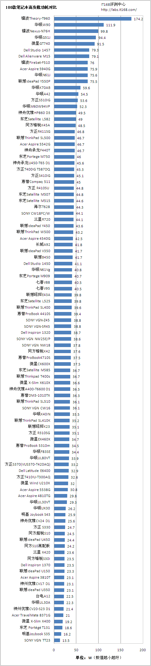 在高負荷的運行環境下,我們通過UNI-T UT71E智能數字萬用表測試出的成績可以看出,其中游戲組和高性比組的多數產品由于具有較高端的硬件搭配,所以具有較高的功耗。這也讓我們從一個側面看出當今中高端游戲配置機型為了保證大型3D游戲的順暢運行,在整機的能耗方面已經開始向傳統的臺式機看齊,同時也勢必會對其續航能力造成直接影響。因此,這部分機型不會將便攜性作為產品的賣點,更多的是強調產品的應用體驗和使用舒適度。相反,在功耗排序的前20款低功耗產品均是采用了CULV平臺,而且除了功耗較低之外,其產品定位也是以超輕為主打。如此低的功耗如果在硬件的搭配方面選擇一款較大容量的電池,其續航的表現將會比定位主流游戲娛樂的筆記本產品有著明顯的優勢。