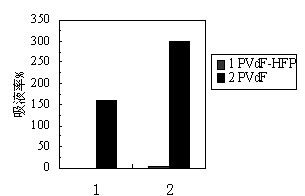 在RH<3%的環境中,將待測膜在1M LiPF6/EC+DMC(v/v=1:1)電解液中浸泡10分鐘后取出,夾在濾紙中吸去表面游離電解液,分別稱取吸液前后待測膜的重量W1、W2,吸液率的計算如下: