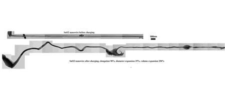 在研究中他們意外的發(fā)現(xiàn),二氧化錫納米線在充電過(guò)程中長(zhǎng)度幾乎拉伸了一倍,而不是像之前的預(yù)測(cè)那樣寬度拉伸。這樣的發(fā)現(xiàn)有助于改善鋰電池設(shè)計(jì),防止導(dǎo)致電池壽命縮短的內(nèi)部短路現(xiàn)象。