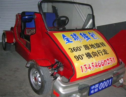 只見滿臉笑容的蘇保國,在空地上熟練地操作著他那輛車輪能做90度旋轉的電動汽車:前進、后退,然后改變輪胎的方向使車子橫向行進!
