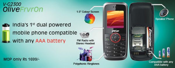對(duì)使用者來說,手機(jī)續(xù)航力永遠(yuǎn)是大家最頭痛的問題。Olive Telecom India 這家印度公司聽到了大家的心聲,推出了 FrvrOn V-G2300 這款用 AAA 電池蓄電的 GSM 手機(jī)(對(duì),就是傳說中的2.5G手機(jī)),干電池幾乎可以隨處充電。這部看似陽春的手機(jī),搭載1.5寸彩色屏幕和 FM 收音機(jī)的功能。更酷的是,這款手機(jī)相容于600mAh的鋰電池和3A電池,把鋰電池當(dāng)做原本的手機(jī)第一電池,單顆電池就當(dāng)做急用。