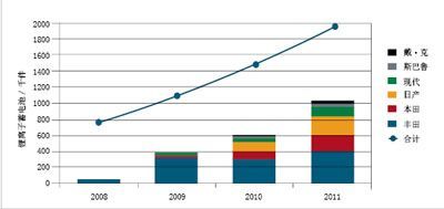 圖1 HEV混合動力車用蓄電池至2011年的市場預測到2011年時,鋰離子蓄電池的需求量將會向鎳氫電池一樣