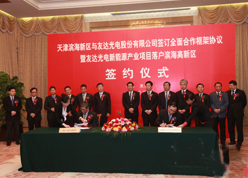 天津濱海高新區(qū)管委會主任趙海山與友達(dá)光電公司董事長李焜耀簽署項目落戶協(xié)議。