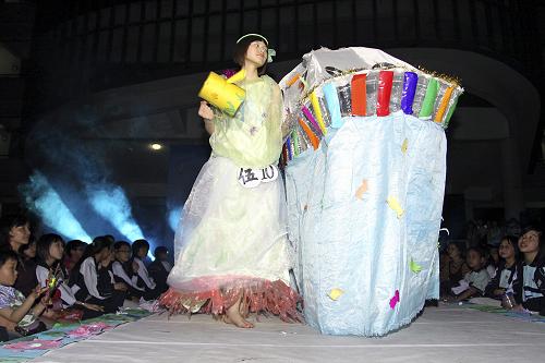 當晚,該校105名學生“模特”展示了用廢光盤、塑料袋、廢舊磁帶、一次性桌布等材料自制的“環保時裝”。