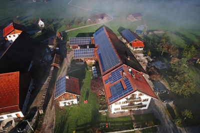 光伏電能巴伐利亞農(nóng)場的屋頂太陽能電池板,當(dāng)光束射到半導(dǎo)體(通常是硅)上時將產(chǎn)生電流。不像聚光太陽能系統(tǒng),這是太陽能發(fā)電另外一種方式,光伏系統(tǒng)可以小規(guī)模的有效運作。