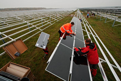 工人安裝在太陽能電池板,這里橫跨超過二百七十零英畝,是前東德的軍事基地。這里將輸送40兆瓦到Waldpolenz太陽能公園。于2008年底建成,是世界第四大光伏電站。太陽能在德國的利益來源于對太陽能源電力生產(chǎn)商補(bǔ)貼的規(guī)定。旨在大力發(fā)展太陽能基礎(chǔ)設(shè)施,政府鼓勵的效果十分顯著。