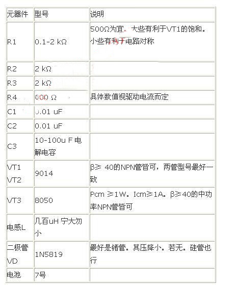 現進行估算。驅動一個LED約要100mW。電源的Po約為20mW。為了保證供給,按P=100mW計算。取η=80%,再隨便找一個幾百uH的電感,如500 uH:另一方面,根據能量守恒。3.3V約為1.2V的3倍。再由于效率問題。電感的驅動電流差不多要LED工作電流的3-4倍,就取為120mA,這樣一來。便可算出振蕩頻率為34kHz左右,這樣,取R=2kΩ,C=0.01 uF便能達到要求。確定參數時。頻率可高不可低,電感寧大勿小,這樣才能保證輸出功率足夠大,才能有足夠的調節空間。