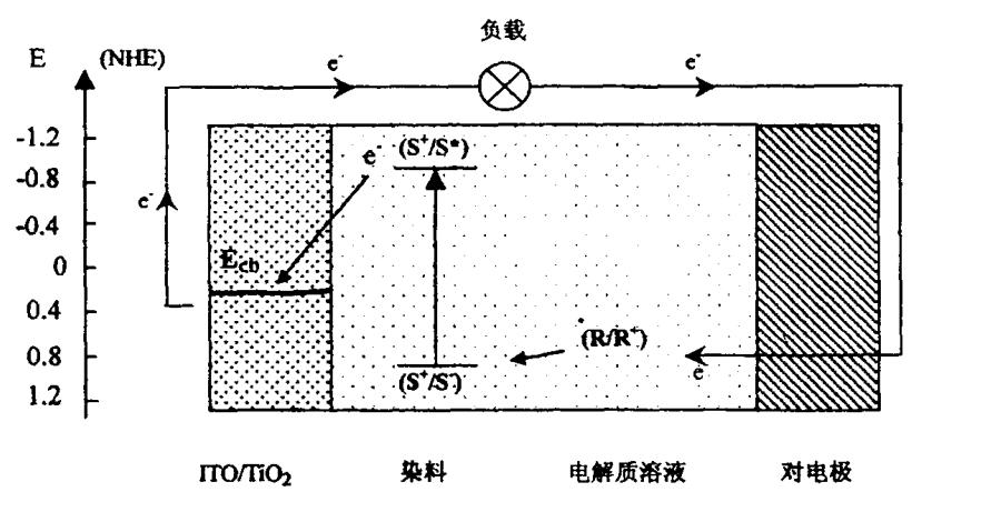染料敏化太陽能電池的優點在于其轉化效率高,制作工藝簡單,生產成本低。電池采用多孔的二氧化鈦納米晶體材料作為基板,上面覆蓋吸收光的染料敏化劑。陽光穿過電池表面的透明電極照射在染料層激發電子躍遷,電子隨后注入二氧化鈦導帶,之后穿過電極驅動外部電路,染料電池與植物中葉綠素吸收陽光的原理類似。