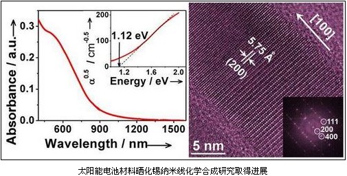 中科院大連化學物理研究所潔凈能源國家實驗室太陽能研究部、催化基礎國家重點實驗室分子催化與原位表征研究組(503組)李燦院士、張文華研究員領導的小組在太陽能電池新材料硒化錫(SnSe)的合成研究中取得進展。
