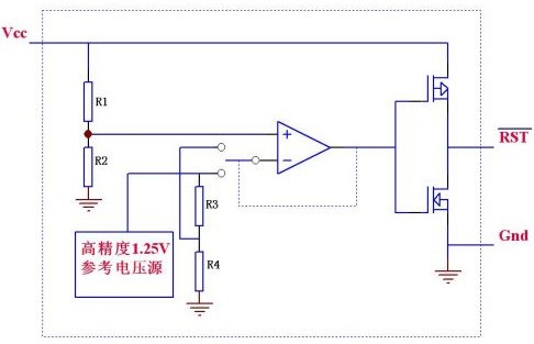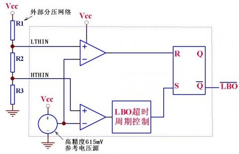 IC內含一個高精度的615mV基準電壓源、兩個比較器、一個RS觸發器和其它一些邏輯電路,其大致功能是:VCC電壓或其它待檢測電壓通過R1-R3組成的分壓網絡接在IC的LTHIN /HTHIN檢測引腳,當待測電壓下降導致LTHIN引腳低于615mV時,輸出腳LBO輸出低電平,而如果待測電壓上升導致HTHIN引腳高于615 mV時,經過內部邏輯判斷和簡單延時后,輸出腳LBO輸出高電平。