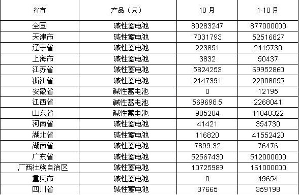 統計數據顯示2011年1-10月中國堿性蓄電池產量為877000000只。
