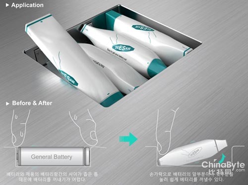 當電子設備需要更換電池時,由于電池倉的設計緊湊,要想取出廢舊電池往往需要花費不少力氣。設計師Young-Suk Kim將AA電池外形做了改變,中間肥大,兩端則扁平,取用時,只需用手按壓一端,另一端就會像蹺蹺板一樣翹起來。