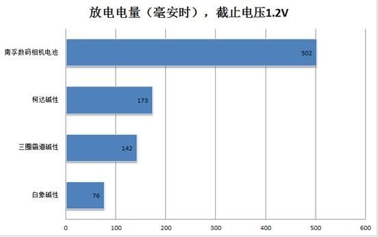 如果只以某款電池在小電流(比如0.2A)放電到較低電壓(比如0.9V)時放出的電量來比較的話,就是您看到圖中的情況。三圈霸道電池最牛,而且還挺便宜,南孚數碼相機只能位列第三,而且還巨貴無比。1.3元得白象電池電量是7元南孚數碼相機電池電量的95%,但前提是小電流放電,并且截止電壓0.9V。電池值與不值要結合它的使用環境,比如在某些數碼相機中,單節電池電壓低于1.2V后就自動關機了,那么鎳干電池確實可以提供比白象多5倍的電量。而更多數的用電器不會對電壓如此敏感,如果它在單節電池電壓0.9V時還可以工作,如果是大功率用電器,電池續航時間上的差別就是第九張圖呈現的情況,差別有一些,但不是很大。如果是小功率用電器的話,就和當前這張圖呈現的情況一致,差別更小。對消費者的建議:遙控器什么的買個最便宜得電池就夠了。不然白花冤枉錢。