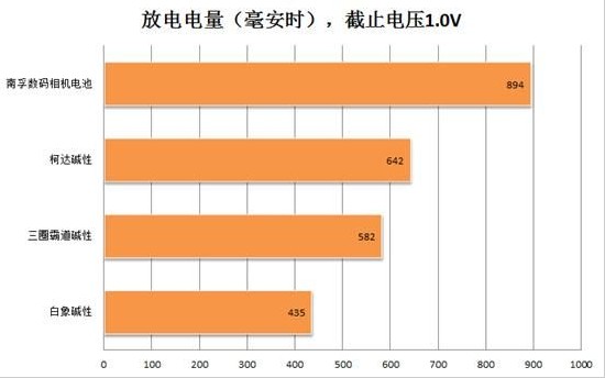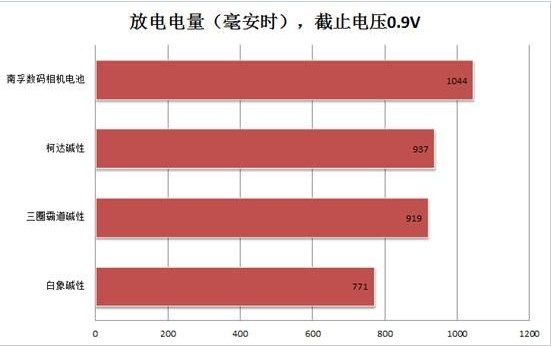 在放電到1.1V時,四位的先后順序沒有變化,但是差距變小了一些,南孚數碼相機電池的電量比第二名多一倍。白象電池落后已經不那么明顯了。