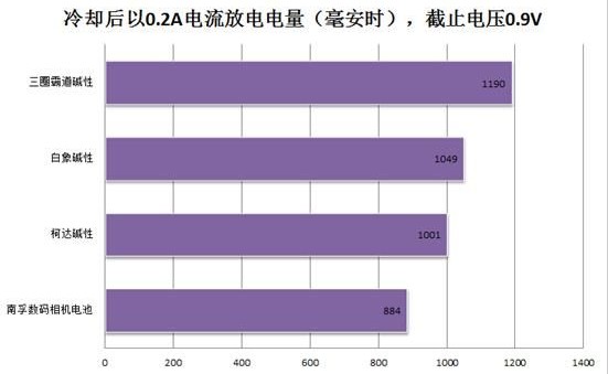 把放電到0.9V的這四節電池放置了2個小時。然后用0.2A的電流再一次給他們放電,這次的截止電壓選定為0.9V。來看他們能繼續放出多少電。最末一名是南孚數碼相機電池,也許是他在之前耗盡了大部分能量。第一名是三圈霸道,看來后勁很足,只不過對模型來說,0.2A的放電情況只存在于遙控器吧,白象和柯達堿性電池都放出了1000毫安時左右的電量。