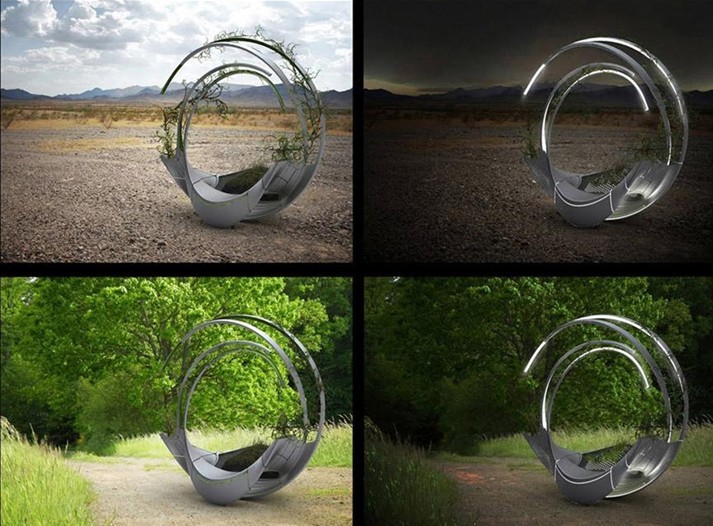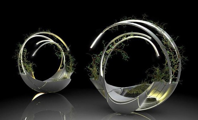 ec-O椅子是一臺具有綠色理念的多功能環保系統,休息區內的太陽能發電板在白天收集能量以供夜晚使用。系統收集雨水提供給其中的植物以確保植物健康生長。植物沿著椅子上端圓形結構生長,為用戶提供了一個宛如叢林的天蓬。ec-O椅子由Steven MA設計,Bio-Aluminum.和Bio-Glass制造。