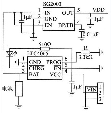 LTC4065的電壓輸入端VCC所允許的輸入電壓在3.75~5.5 V之問。目前市場上的5 V穩壓電源的輸出電壓一般并不穩定,很多時候會超過6 V而給充電帶來不良影響。LTC4065內部具有穩壓電路能夠起到一定的穩壓作用,一般應用情況下可直接連接穩壓電源。如果應用需求較高,也可在VCC的前級加一個1 A的三端穩壓電源芯片。在圖2所示電路中,將VCC直接接至穩壓電源,鋰電池通過一個線性穩壓芯片SG2003為工作電路提供電源。