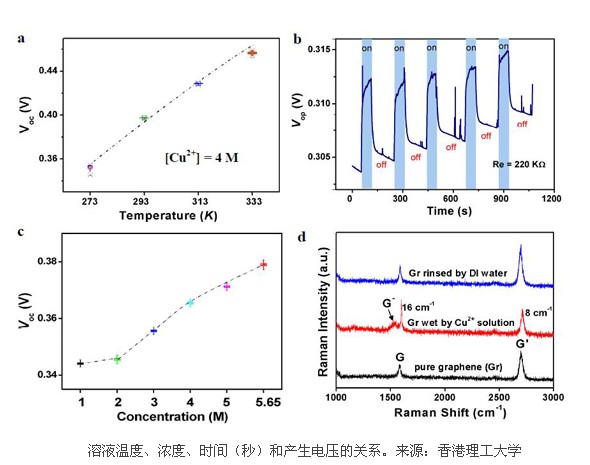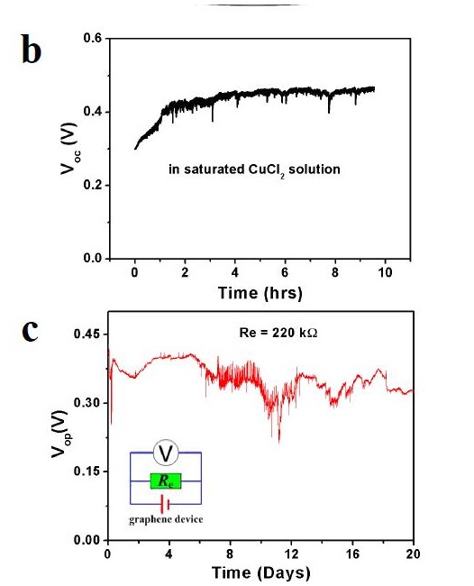 石墨烯電池在飽和氯化銅溶液中,時(shí)間(小時(shí)、天數(shù))和產(chǎn)生電壓的關(guān)系。來(lái)源:香港理工大學(xué)