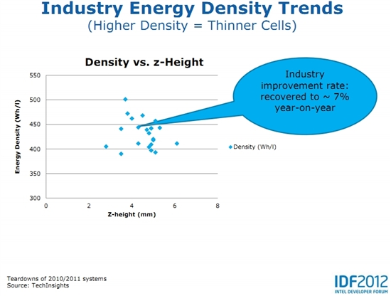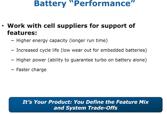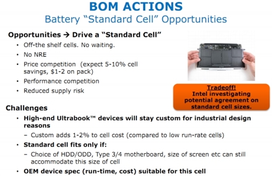 對(duì)于筆記本和平板電腦來(lái)說(shuō),減小尺寸和重量最大的一個(gè)障礙是電池。雖然也存在一些高容量的小尺寸型號(hào)如目前MacBook Air和Ultrabook上使用的產(chǎn)品,但由于其不符合標(biāo)準(zhǔn)而無(wú)法通用。IDF 2012上Intel提出,為了改變這一點(diǎn)需要制定一個(gè)所有Ultrabook均通用的輕薄電池技術(shù)標(biāo)準(zhǔn)。