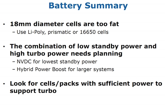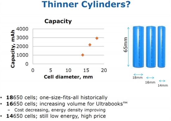 Intel暫定的Ultrabook標(biāo)準(zhǔn)電池尺寸為60mm*80mm,或直徑為16mm的16650型號(hào),比一般筆記本電池通用的18mm直徑型號(hào)要小一點(diǎn)。雖然也有著更小的14mm電池,但I(xiàn)ntel稱因其成本太高、電量也不足所以不考慮使用。