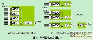 接下來,就給定的機械概念設(shè)計而言,監(jiān)視硬件拓?fù)溆删_定義的、所需支持的電池數(shù)量決定。在汽車應(yīng)用中,一般情況下總共會有 100 個以上的電池測量點,而且系統(tǒng)的模塊化將決定一個給定的電路系統(tǒng)測量多少個電池。最常見的情況是,以安全斷接“維修插頭”方式,將所有電池分成至少兩個子組。通過在故障情況下保持電壓低于 200V,這種方法最大限度地降低了維修人員可能遇到的觸電危險。外形尺寸較大的電池組意味著,要采用兩套隔離的數(shù)據(jù)采集系統(tǒng),每套也許支持 50 個電池分接頭。在有些情況下,所有電子組件都在一個經(jīng)濟實惠的印刷電路板上,但是這需要大量互連,如圖 1 (a)所示。或者,電子組件也可以分散放置,更加緊密地集成在電池模塊中,但是這需要采用遙測鏈接方法。為了實現(xiàn)可靠的數(shù)據(jù)完整性,內(nèi)置于汽車線束中的遠(yuǎn)端測量功能電路必須采用一種堅固型協(xié)議,例如廣泛使用的 CAN 總線。盡管真正的 CAN 總線接口涉及幾個網(wǎng)絡(luò)層,但是可以很方便地采用 PHY 層構(gòu)成 BMS LAN 結(jié)構(gòu),以高效率地進行模塊內(nèi)的通信。這類分布式結(jié)構(gòu)如圖 1 (b)所示。該拓?fù)湓试S在幾個小型處理器之間分配計算工作量,從而降低所需的數(shù)據(jù)傳輸速率,并減輕 LAN 方法可能引起的 EMI 問題。最終的 BMS 應(yīng)用接口很可能是至一個主系統(tǒng)管理處理器的 CAN 總線接線,而且將需要定義 (或在一開始規(guī)定) 特定的信息事務(wù)處理。